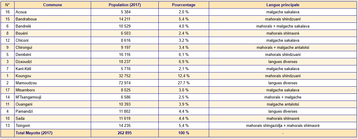 Tableau présentant la liste des 17 communes de Mayotte en 2017, d'après l'Institut national de la statistique et des études économiques (INSEE).